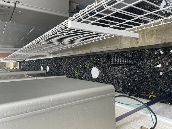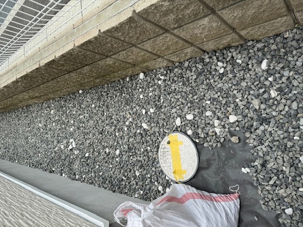 既存の砕石(砂利)を撤去したうえで、駐車場にはコンクリートを打設し、犬走り部分は防草マットと砕石を組み合わせた施工で雑草対策を行ないました。