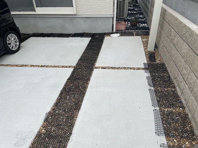 コンクリート舗装と防草マットを組み合わせることで、日々の手入れの負担を減らし、見た目もすっきりと保ちやすくなります。
