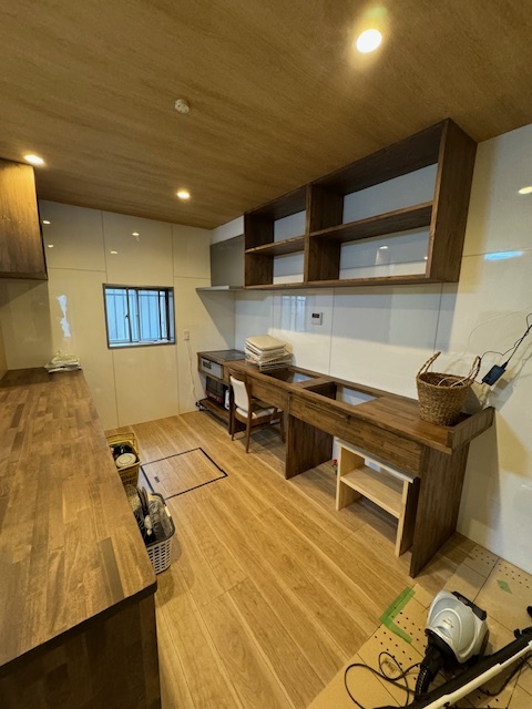 キッチン前のカウンターには収納棚を設置し、よく使う小物や書類、生活用品をまとめやすい仕様としています。